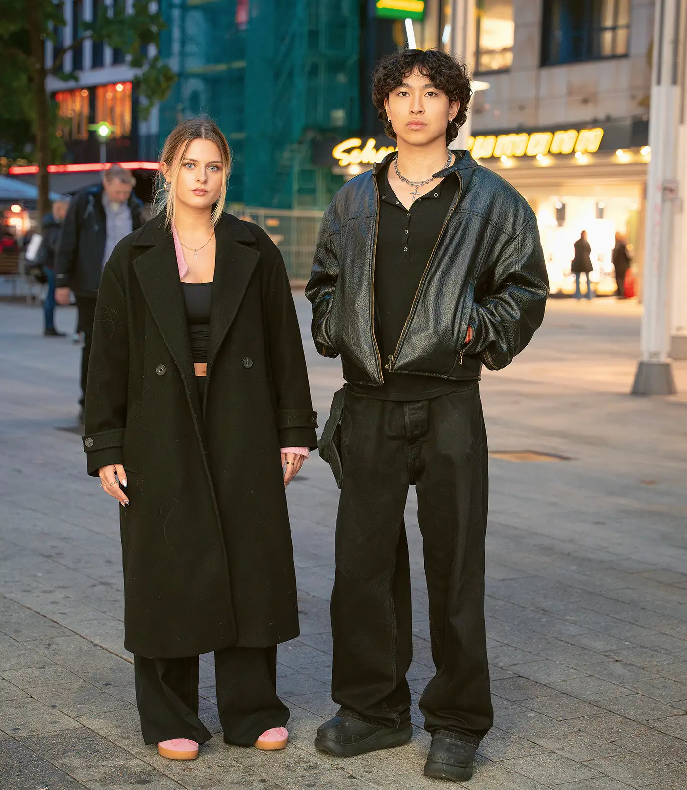 Leder ist 2025 nicht nur Trend, sondern Statement! Der Look von Lea Rose und Nam Pham beweist, wie stark Minimalismus wirken kann. Besonders die oversized Lederjacke mit kastigen Schultern transportiert Coolness und Selbstbewusstsein, ohne laut zu sein. Das monochrome Schwarz verleiht dem Outfit Tiefe und macht es zeitlos – urbaner Streetstyle in Reinform. Die weite Hose betont die lässige Silhouette, während dezente Accessoires wie die silberne Kette für einen modernen Streetwear-Twist sorgen. Leder zeigt sich hier in seiner puristischen Form: clean, stark, vielseitig.