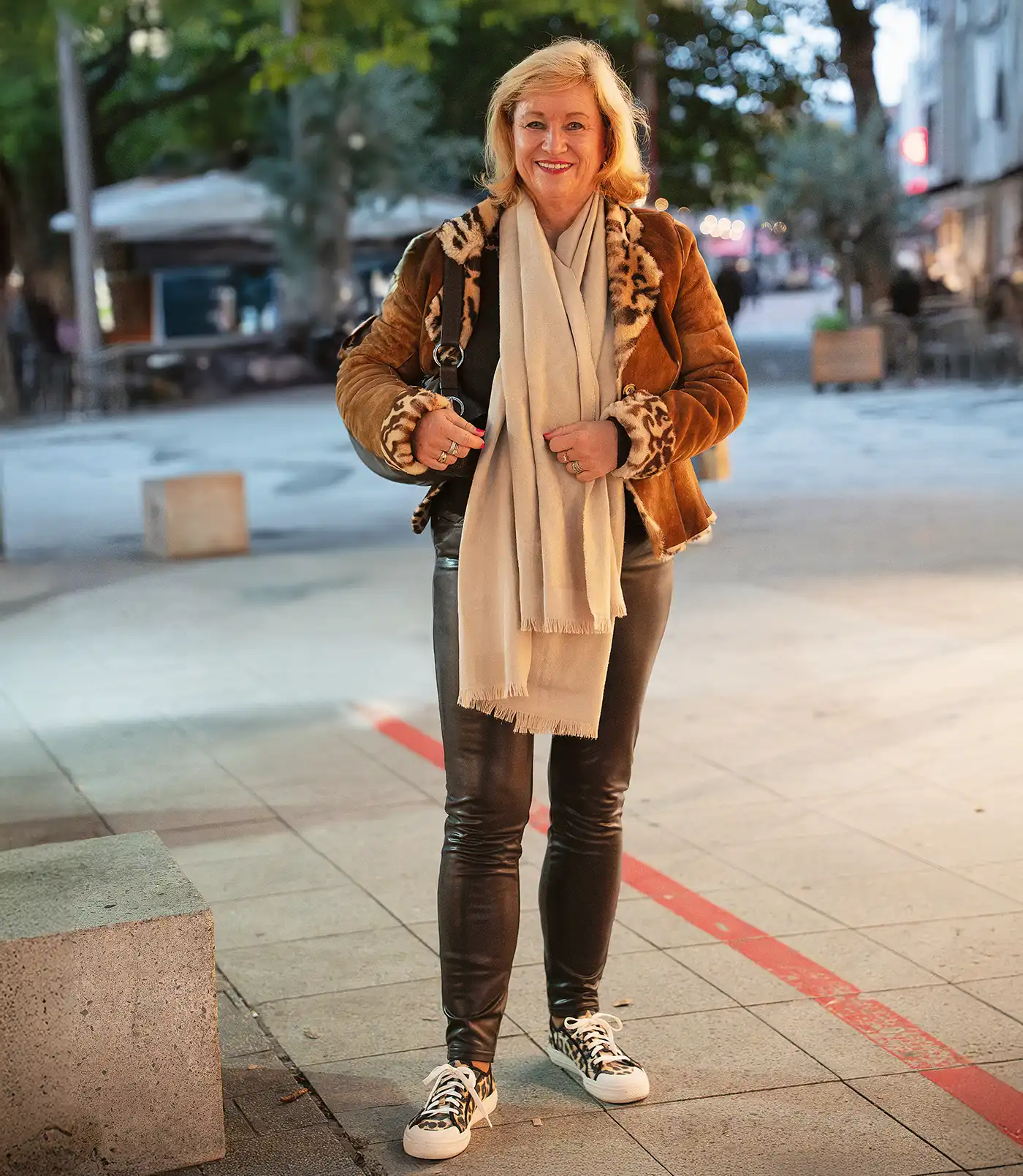 Leo-Print ist zurück – elegant, selbstbewusst und mit einem Hauch Extravaganz. Die braune Shearling-Jacke mit Leo-Details an Kragen und Ärmeln bringt das ikonische Muster perfekt zur Geltung, ohne aufdringlich zu wirken. In Kombination mit schwarzer Lederhose und einem neutralen Schal entsteht ein Look, der Coolness und Eleganz auf lässige Weise kombiniert. Die Leo-Sneaker greifen das Muster spielerisch wieder auf und runden das Outfit ab. Ein starker, moderner City-Look, der zeigt: Animal-Prints funktionieren auch subtil und richtig stilvoll.