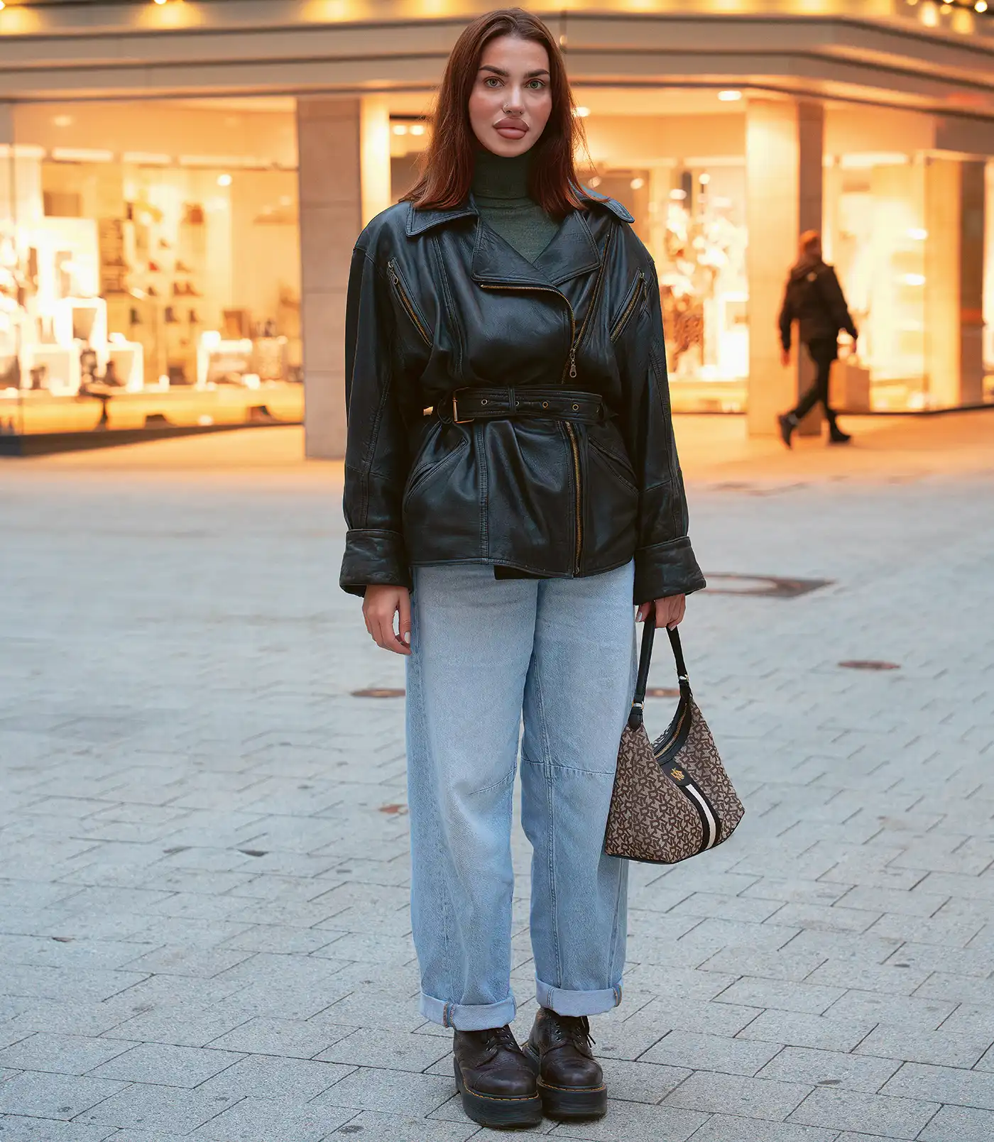 Denim bleibt das It-Material. Die helle, weit geschnittene Jeans bringt das 90s-Revival mit lässiger Selbstverständlichkeit auf die Straße und wird zum ruhigen, aber starken Statement-Piece. In Kombination mit dem dunkelgrünen Rollkragenpullover und der oversized Lederjacke entsteht ein moderner Streetstyle, der auf klare Linien, Struktur und Qualität setzt. Die Plateau-Schuhe und die kleine Monogramm-Bag geben dem Look einen dezenten Vintage-Touch, ohne die cleane Ästhetik zu stören. Das Ergebnis: ein zeitloser Denim-Look, der sowohl modern als auch zeitlos wirkt.