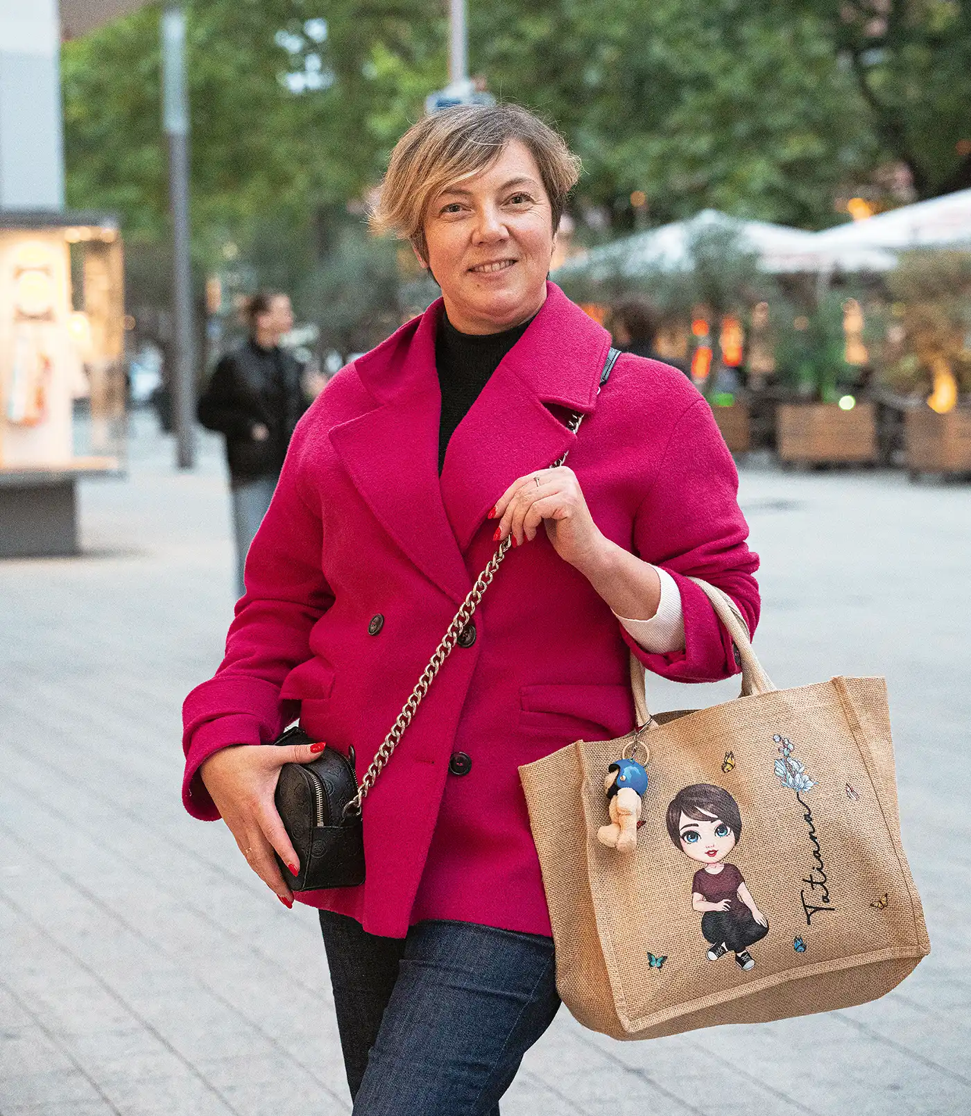 Powerfarben wie Pink bringen diesen Herbst Energie auf die Straße und dieser Look zeigt, wie modern das wirkt. Der kräftig pinkfarbene Mantel setzt ein selbstbewusstes Statement und durchbricht das graue Stadtbild mit Leichtigkeit. In Kombination mit dunkler Jeans und schwarzem Rollkragen bleibt der Look elegant und ausgewogen. So bekommt die Farbe die Bühne, die sie verdient. Verspielte Details wie die personalisierte Jutetasche sorgen für Persönlichkeit und einen charmanten Twist. Ein City-Look voller Frische, Stärke und Stilgefühl.