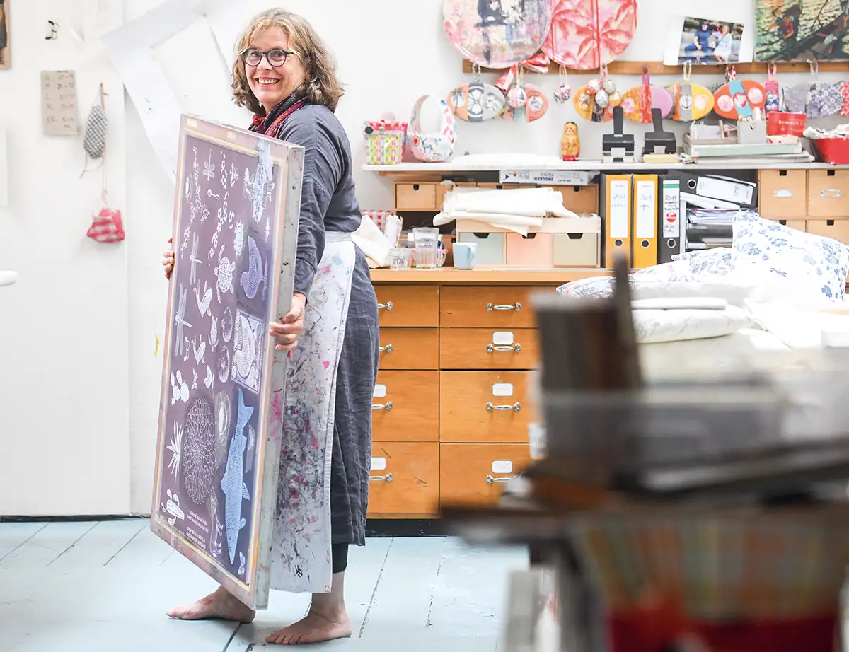 Per Siebdruck und Nähmaschine verwandeln Orike Muth und ihre Schwester Regine sie in moderne praktische Gegenstände des täglichen Gebrauchs wie Geschirrhandtücher, Kissen, Topflappen und Schürzen. Auch Lampions, Tabletts, Weihnachtskugeln entstehen bei ihnen in der Hinterhofwerkstatt.